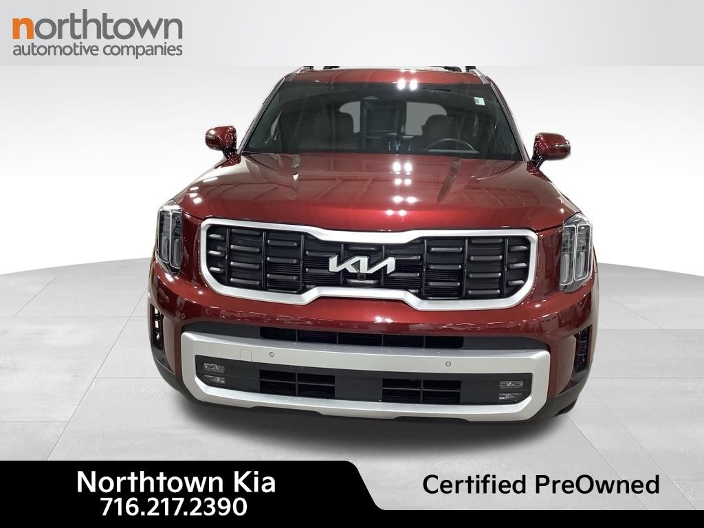 See the rest of our inventory at: NORTHTOWNKIA.COM Mahogany Interior Color Package, Towing Package (Self Leveling Rear Suspension and Towing Hitch Standard), Kia Certified Pre-Owned Certified, 10 Speakers, 3.510 Axle Ratio, 3rd row seats: split-bench, 4-Wheel Disc Brakes, ABS brakes, Air Conditioning, Alloy wheels, AM/FM radio: SiriusXM, Apple CarPlay & Android Auto, Auto High-beam Headlights, Auto-dimming Rear-View mirror, Automatic temperature control, BACKUP CAMERA, Brake assist, Bumpers: body-color, Carpet Floor Mats, Compass, Cross Bars, Delay-off headlights, Driver door bin, Driver vanity mirror, Dual front impact airbags, Dual front side impact airbags, Electronic Stability Control, Emergency communication system: 911 Connect, Four wheel independent suspension, Front anti-roll bar, Front Bucket Seats, Front Center Armrest, Front dual zone A/C, Front fog lights, Front reading lights, Fully automatic headlights, Garage door transmitter: HomeLink, harman/kardon® Speakers, Heated & Ventilated Front Bucket Seats, Heated door mirrors, Heated front seats, Illuminated entry, Knee airbag, Leather Seat Trim, Leather Shift Knob, Leather steering wheel, Low tire pressure warning, Memory seat, Navigation System, Occupant sensing airbag, Outside temperature display, Overhead airbag, Overhead console, Panic alarm, Passenger door bin, Passenger vanity mirror, Power door mirrors, Power driver seat, Power Liftgate, Power moonroof, Power passenger seat, Power steering, Power windows, Radio data system, Radio: AM/FM Harman Kardon Premium Audio System, Rear air conditioning, Rear anti-roll bar, Rear audio controls, Rear reading lights, Rear side impact airbag, Rear window defroster, Rear window wiper, Reclining 3rd row seat, Remote keyless entry, Roof rack, Security system, Smart Key w/ Push Button and Remote Start, Speed control, Speed-sensing steering, Split folding rear seat, Spoiler, Steering wheel mounted audio controls, Tachometer, Telescoping steering wheel, Tilt steering wheel, Traction control, Trip computer, Turn signal indicator mirrors, Variably intermittent wipers, Ventilated front seats, and Wheels: 20" x 7.5" Black Finish.
