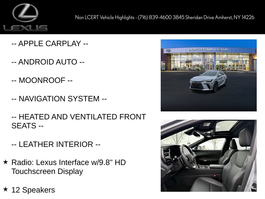 -- APPLE CARPLAY --, -- ANDROID AUTO --, -- MOONROOF --, -- NAVIGATION SYSTEM --, -- HEATED AND VENTILATED FRONT SEATS --, -- LEATHER INTERIOR --, 12 Speakers, 8-Way Power Driver & Front Passenger Seat Adjusters, ABS brakes, Active Cruise Control, Alloy wheels, Compass, Electronic Stability Control, Emergency communication system: Safety Connect (10-year trial), Front dual zone A/C, Garage door transmitter: HomeLink, Genuine wood console insert, Heated & Ventilated Front Bucket Seats, Heated door mirrors, Heated front seats, Heated steering wheel, Illuminated entry, Low tire pressure warning, Memory seat, Power driver seat, Power Liftgate, Power moonroof, Radio data system, Radio: Lexus Interface w/9.8" HD Touchscreen Display, Rain sensing wipers, Remote keyless entry, Split folding rear seat, Traction control, Ventilated front seats, Wheels: 21" 20-Spoke Alloy w/Dark Gray Met Finish.