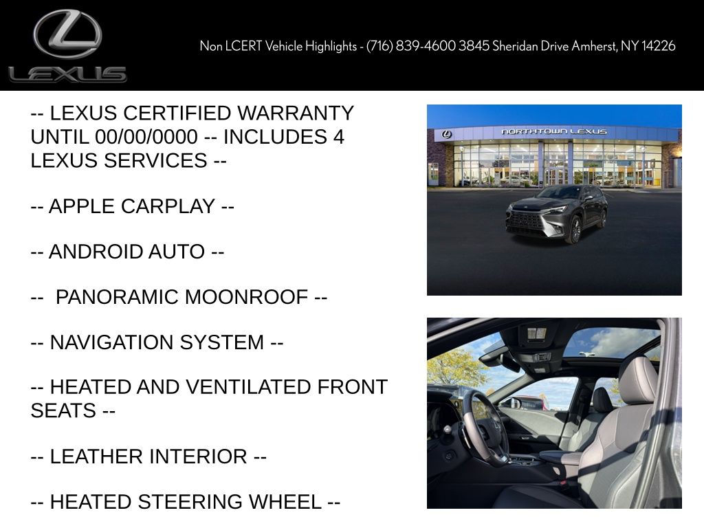 -- LEXUS CERTIFIED WARRANTY UNTIL 3/13/2031-- INCLUDES 4 LEXUS SERVICES --, -- APPLE CARPLAY --, -- ANDROID AUTO --, -- PANORAMIC MOONROOF --, -- NAVIGATION SYSTEM --, -- HEATED AND VENTILATED FRONT SEATS --, -- LEATHER INTERIOR --, -- HEATED STEERING WHEEL --, ABS brakes, Active Cruise Control, Alloy wheels, Electronic Stability Control, Front dual zone A/C, Heated & Ventilated Front Seats, Heated door mirrors, Heated front seats, Illuminated entry, Low tire pressure warning, Navigation System, Navigation system: Drive Connect Cloud Navigation (3-year trial subscription included), Power Liftgate, Power moonroof, Remote keyless entry, Traction control.