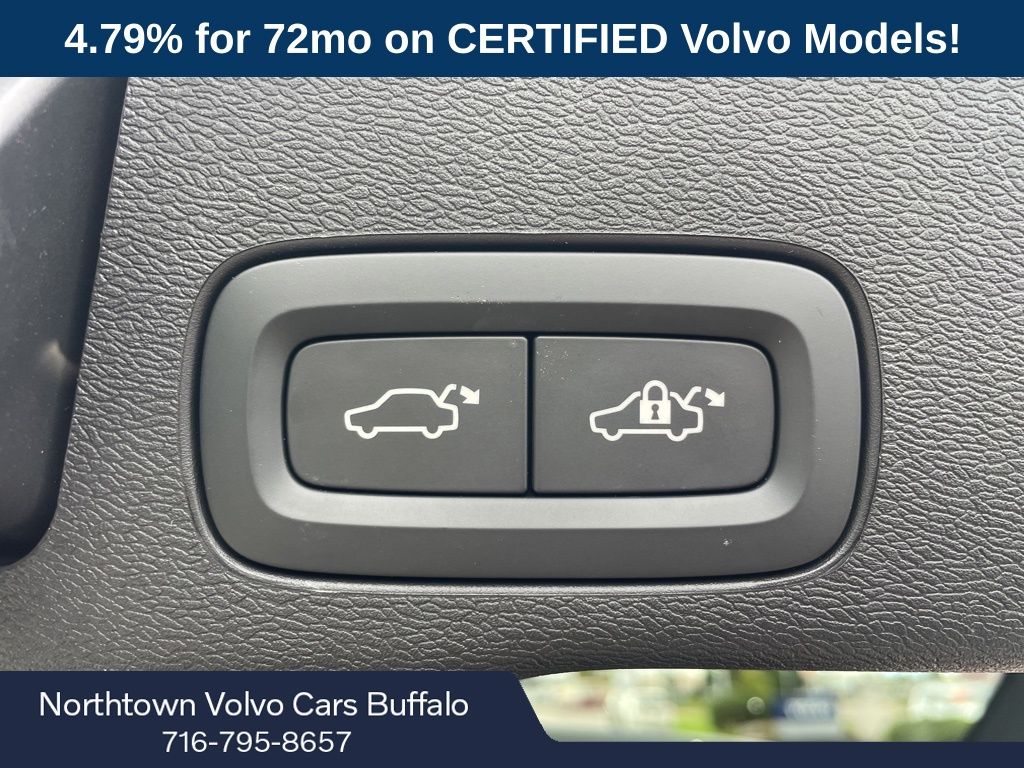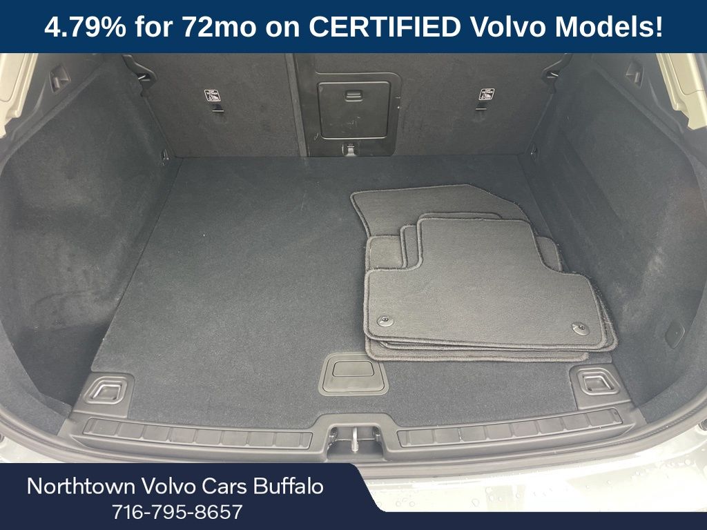 Climate Package (Heated Rear Seats and Heated Steering Wheel), Volvo Certified Pre-Owned Certified, AWD, Heated Front Bucket Seats, Power moonroof, Power Operated Tailgate, Wheels: 18" 5-Double Spoke Black Diamond Cut Alloy, 10 Speakers, 4-Wheel Disc Brakes, ABS brakes, Air Conditioning, Alloy wheels, AM/FM radio: SiriusXM, Anti-whiplash front head restraints, Apple CarPlay, Auto High-beam Headlights, Auto-dimming door mirrors, Auto-dimming Rear-View mirror, Automatic temperature control, Brake assist, Bumpers: body-color, Delay-off headlights, Driver door bin, Driver vanity mirror, Dual front impact airbags, Dual front side impact airbags, Electronic Stability Control, Emergency communication system: Volvo Cars App w/4 Year Subscription, Exterior Parking Camera Rear, Four wheel independent suspension, Front anti-roll bar, Front Bucket Seats, Front Center Armrest, Front dual zone A/C, Front fog lights, Front reading lights, Fully automatic headlights, Heated door mirrors, Heated front seats, Illuminated entry, Knee airbag, Leather Shift Knob, Leatherette Upholstery, Low tire pressure warning, Memory seat, Occupant sensing airbag, Outside temperature display, Overhead airbag, Panic alarm, Passenger door bin, Passenger vanity mirror, Power door mirrors, Power driver seat, Power passenger seat, Power steering, Power windows, Radio data system, Radio: High Performance Audio System, Rain sensing wipers, Rear anti-roll bar, Rear fog lights, Rear reading lights, Rear seat center armrest, Rear window defroster, Rear window wiper, Remote keyless entry, Security system, Speed control, Split folding rear seat, Spoiler, Steering wheel mounted audio controls, Tachometer, Telescoping steering wheel, Tilt steering wheel, Traction control, Trip computer, Turn signal indicator mirrors, and Variably intermittent wipers.