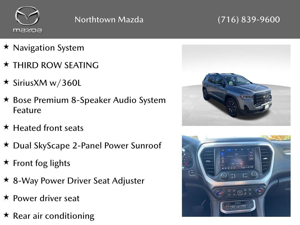 See the rest of our inventory at: NORTHTOWN MAZDA.COM Elevation Edition (20" Machined Aluminum Wheels and Gloss Black Roof Rails), Preferred Equipment Group 4SA, 155 Amp Alternator, 18" Aluminum Wheels, 3rd row seats: split-bench, 4-Way Manual Passenger Seat Adjuster, 4-Wheel Disc Brakes, 6-Passenger (2-2-2 Seating Configuration), 8 Speakers, 8-Way Power Driver Seat Adjuster, ABS brakes, Air Conditioning, Alloy wheels, AM/FM radio: SiriusXM with 360L, Apple CarPlay/Android Auto, Auto High-beam Headlights, Auto-dimming Rear-View mirror, Automatic temperature control, Bose Premium 8-Speaker Audio System Feature, Brake assist, Bumpers: body-color, Compass, Delay-off headlights, Driver door bin, Driver vanity mirror, Dual front impact airbags, Dual front side impact airbags, Dual SkyScape 2-Panel Power Sunroof, Electronic Stability Control, Emergency communication system: OnStar and GMC connected services capable, Four wheel independent suspension, Front & Rear Black GMC Emblems (LPO), Front anti-roll bar, Front Bucket Seats, Front Center Armrest, Front dual zone A/C, Front fog lights, Front License Plate Bracket, Front reading lights, Fully automatic headlights, Garage door transmitter, HD Radio, Heated door mirrors, Heated Driver & Front Passenger Seats, Heated front seats, Illuminated entry, Knee airbag, Low tire pressure warning, Navigation System, Occupant sensing airbag, Outside temperature display, Overhead airbag, Overhead console, Panic alarm, Passenger door bin, Passenger vanity mirror, Perforated Leather-Appointed Seat Trim, Power door mirrors, Power Driver Lumbar Control Seat Adjuster, Power driver seat, Power Liftgate, Power steering, Power windows, Premium audio system: GMC Infotainment System, Radio data system, Radio: AM/FM 8" Diagonal Multi-Touch Navigation, Rear air conditioning, Rear anti-roll bar, Rear reading lights, Rear window defroster, Rear window wiper, Remote keyless entry, Roof rack: rails only, Security system, SiriusXM w/360L, Speed control, Speed-sensing steering, Spoiler, Steering wheel mounted audio controls, Tachometer, Telescoping steering wheel, Tilt steering wheel, Traction control, Trip computer, Turn signal indicator mirrors, Variably intermittent wipers, Voltmeter, Wheels: 20" Machined Aluminum (DISC), and Wireless Apple CarPlay/Wireless Android Auto.