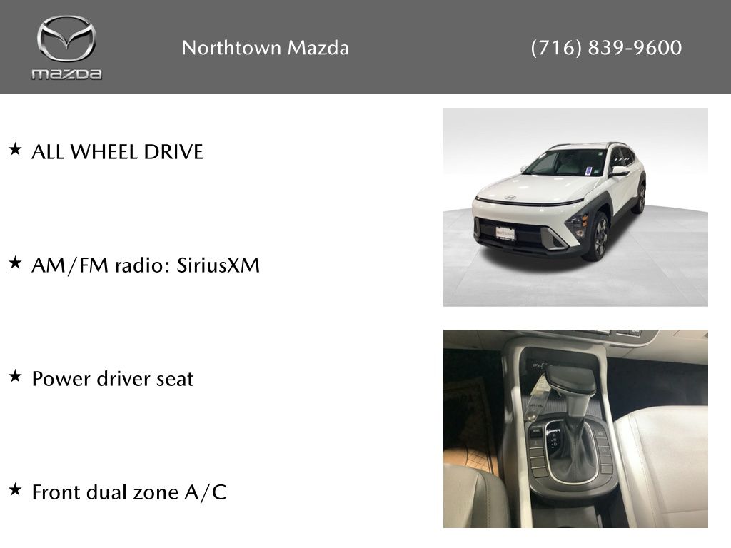 See the rest of our inventory at: NORTHTOWN MAZDA.COM Option Group 01, Alloy wheels, AM/FM radio: SiriusXM, Apple CarPlay & Android Auto, Brake assist, Electronic Stability Control, Emergency communication system: Bluelink+, Exterior Parking Camera Rear, Front dual zone A/C, Heated door mirrors, Leather steering wheel, Power driver seat, 4-Wheel Disc Brakes, 6 Speakers, 6.052 Axle Ratio, ABS brakes, Air Conditioning, Auto High-beam Headlights, Automatic temperature control, Bumpers: body-color, Cargo Tray, Carpeted Floor Mats, Cloth Seat Trim, Cross Rails, Delay-off headlights, Driver door bin, Driver vanity mirror, Dual front impact airbags, Dual front side impact airbags, First Aid Kit, Four wheel independent suspension, Front anti-roll bar, Front Bucket Seats, Front Center Armrest, Front reading lights, Fully automatic headlights, Illuminated entry, Leather Shift Knob, Low tire pressure warning, Occupant sensing airbag, Outside temperature display, Overhead airbag, Panic alarm, Passenger door bin, Passenger vanity mirror, Power door mirrors, Power steering, Power windows, Radio: AM/FM/HD Radio/SiriusXM Audio System, Rear anti-roll bar, Rear seat center armrest, Rear window defroster, Rear window wiper, Remote keyless entry, Security system, Speed control, Speed-sensing steering, Split folding rear seat, Spoiler, Steering wheel mounted audio controls, Tachometer, Telescoping steering wheel, Tilt steering wheel, Traction control, Trip computer, Turn signal indicator mirrors, Variably intermittent wipers, and Wheels: 18" x 7.0J Glossy Black Alloy.