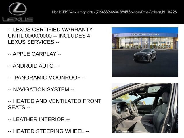 -- LEXUS CERTIFIED WARRANTY UNTIL 00/00/0000 -- INCLUDES 4 LEXUS SERVICES --, -- APPLE CARPLAY --, -- ANDROID AUTO --, -- PANORAMIC MOONROOF --, -- NAVIGATION SYSTEM --, -- HEATED AND VENTILATED FRONT SEATS --, -- LEATHER INTERIOR --, -- HEATED STEERING WHEEL --, 12 Speakers, ABS brakes, Active Cruise Control, Alloy wheels, AM/FM radio: SiriusXM, Compass, Electronic Stability Control, Front dual zone A/C, Heated door mirrors, Heated front seats, Illuminated entry, Low tire pressure warning, Navigation System, Power driver seat, Power Liftgate, Power steering, Power windows, Radio data system, Radio: Lexus Interface w/9.8" HD Touchscreen Display, Remote keyless entry, Traction control, Wheels: 21" 20-Spoke Alloy w/Dark Gray Met Finish.