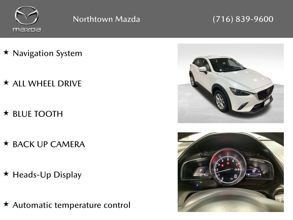 Packed with an impressive array of features, this CX-3 Sport offers the perfect balance of comfort and convenience. Enjoy the convenience of All-Wheel Drive, Bluetooth connectivity, and a Backup Camera, along with premium amenities like a Navigation System, Automatic Temperature Control, and a Heads-Up Display. The CX-3 also comes equipped with cutting-edge technology, including AppLink/Apple CarPlay and Android Auto, ensuring seamless integration with your digital lifestyle.