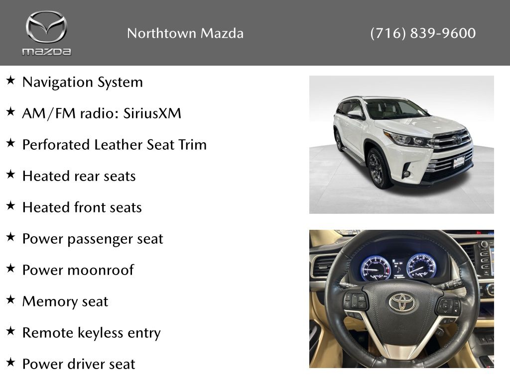 See the rest of our inventory at: NORTHTOWN MAZDA.COM ABS brakes, Active Cruise Control, Alloy wheels, AM/FM radio: SiriusXM, Electronic Stability Control, Front dual zone A/C, Heated door mirrors, Heated front seats, Heated rear seats, Heated steering wheel, Heated/Ventilated Front Bucket Seats, Low tire pressure warning, Memory seat, Navigation System, Perforated Leather Seat Trim, Power driver seat, Power Liftgate, Power moonroof, Power passenger seat, Remote keyless entry, Traction control, 12 Speakers, 3.003 Axle Ratio, 3rd row seats: split-bench, 4-Wheel Disc Brakes, Air Conditioning, Auto High-beam Headlights, Auto-dimming Rear-View mirror, Automatic temperature control, Brake assist, Bumpers: body-color, CD player, Delay-off headlights, Driver door bin, Driver vanity mirror, Dual front impact airbags, Dual front side impact airbags, Emergency communication system: Safety Connect, Exterior Parking Camera Rear, Four wheel independent suspension, Front anti-roll bar, Front Bucket Seats, Front Center Armrest, Front fog lights, Front reading lights, Fully automatic headlights, Garage door transmitter, Illuminated entry, Knee airbag, Leather Shift Knob, Occupant sensing airbag, Outside temperature display, Overhead airbag, Overhead console, Panic alarm, Panoramic Moonroof, Panoramic View Monitor, Passenger door bin, Passenger vanity mirror, Power door mirrors, Power steering, Power windows, Radio: Entune Premium JBL Audio w/Nav & App Suite, Rain sensing wipers, Rear air conditioning, Rear anti-roll bar, Rear reading lights, Rear window defroster, Rear window wiper, Reclining 3rd row seat, Roof rack: rails only, Safety Connect, Security system, Speed control, Speed-sensing steering, Split folding rear seat, Spoiler, Steering wheel mounted audio controls, Tachometer, Telescoping steering wheel, Tilt steering wheel, Trip computer, Turn signal indicator mirrors, Variably intermittent wipers, Ventilated front seats, and Wheels: 19" 5-Spoke Dark-Chromtec Alloy.